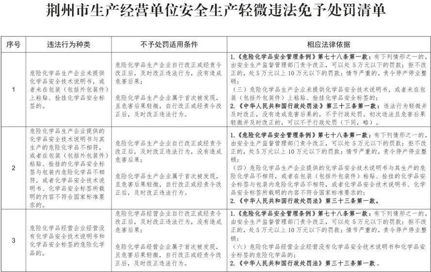 為持續(xù)深入推進安全生產領域“放管服”改革,進一步優(yōu)化營商環(huán)境,助力企業(yè)持續(xù)健康發(fā)展,日前,市應急管理局結合我市實際,修訂并完善了《荊州市生產經營單位安全生產輕微違法免予處罰清單》,規(guī)定24項安全生產輕微違法行為不予行政處罰。