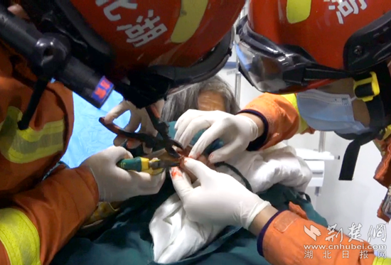 消防員到場后發(fā)現(xiàn),老人右手無名指、小指均被戒指卡死。由于老人手部嚴(yán)重受傷,無法使用切割儀器對戒指進(jìn)行切割,消防員立即使用尖嘴鉗、絕緣剪等工具對老人戒指進(jìn)行剪切。經(jīng)過五分鐘的緊張?zhí)幹?,消防員成功將戒指取下。隨后,醫(yī)生對傷者傷勢進(jìn)行處置。