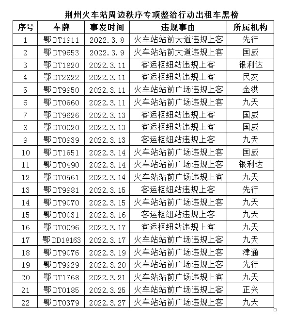 近日,市運(yùn)管局客管辦發(fā)布荊州火車站周邊秩序?qū)m?xiàng)整治行動出租車黑榜,自3月8日專項(xiàng)整治行動開展以來,對22輛違規(guī)上客出租車給予停業(yè)處理。