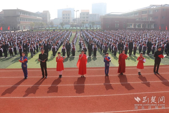 荊楚網(wǎng)(湖北日報網(wǎng))訊(通訊員 陸登鋒)“今天,我們站在綠茵場上,揣著滿懷的激情,我們歌頌人民英雄的榮光,見證如他們所愿的夢想……”3月31日,武穴市師范附屬小學(xué)江林校區(qū)運動場人頭攢動,熱鬧非凡。上千名學(xué)子排列成方陣,在教師的帶領(lǐng)下,慷鏘有力的誓言響徹云霄,“千人清廉誦”活動在一片熱情洋溢的童聲中激情上演。