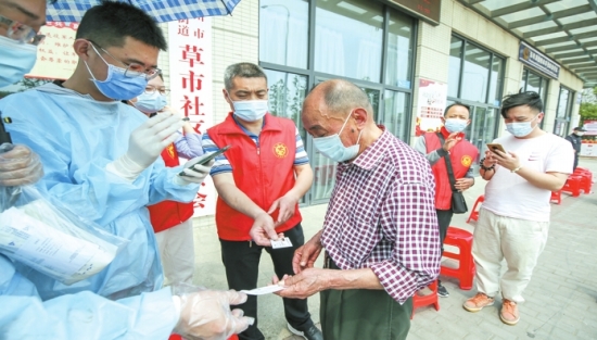 4月12日,在荊州區(qū)東城街道草市社區(qū)核酸檢測點,下沉黨員協(xié)助社區(qū)開展現(xiàn)場引導(dǎo)、信息登記、物資保障等工作。(潘路攝)