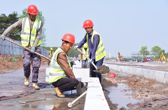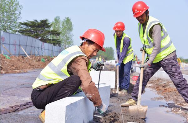 荊江大道御河路至西環(huán)路段,兩名施工人員正在將路肩石擺放到指定位置,另一名施工人員并用水泥填平周圍路面,準備為鋪設路肩石做好準備。