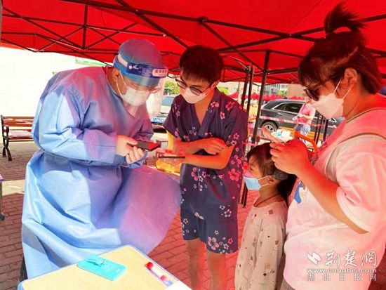 到達指定檢測點,還來不及吃早飯的她早已全副武裝,穿上藍色防護服,戴上透明面罩,為參與混檢的居民錄入信息,掃健康碼。兩個小時過去了,混檢結(jié)束,脫下防護服的她臉上多了幾條長長的勒痕,頭發(fā)早已濕透,她開玩笑說這是“英雄的勛章”。