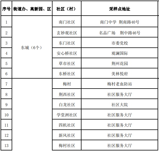 荊州區(qū)、荊州高新區(qū)這些地方可以免費做核酸,采樣點如下:
