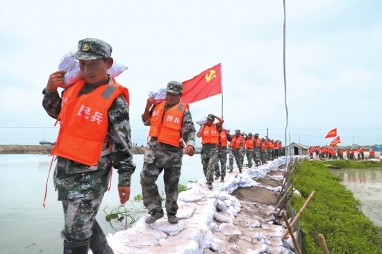 在洪流中筑起“鋼鐵堤岸”。2020年夏天,長湖、洪湖超歷史最高水位,750名部隊官兵肩扛手提加固堤防,筑起防汛安全“堤壩”,與此同時,荊州軍分區(qū)組織民兵迎險逆行,在波谷浪峰中勇挑重?fù)?dān),用血肉之軀構(gòu)建了鋼鐵屏障、生命之舟、安全通道。