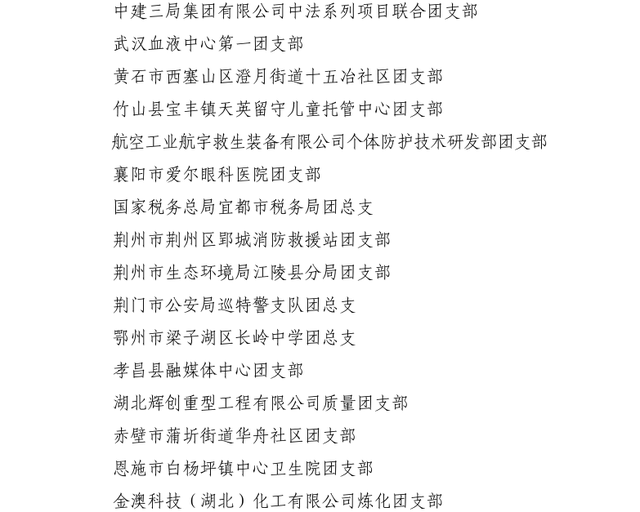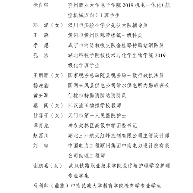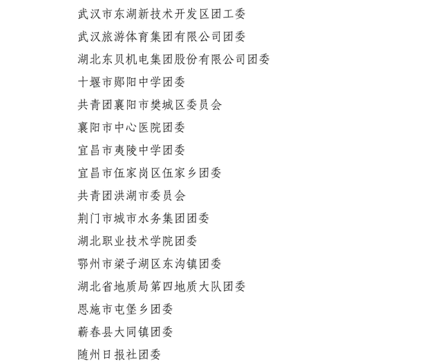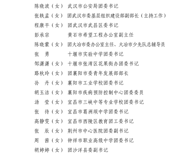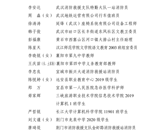 荊州市上榜的集體和個(gè)人分別為:荊州市荊州區(qū)郢城消防救援站團(tuán)支部、荊州市生態(tài)環(huán)境局江陵縣分局團(tuán)支部入圍全省五四紅旗團(tuán)支部;荊州市中心醫(yī)院團(tuán)委副書記張辰(女)入圍全省優(yōu)秀共青團(tuán)干部名單。