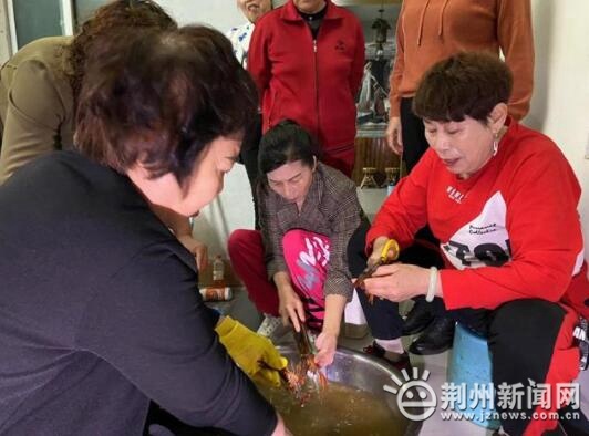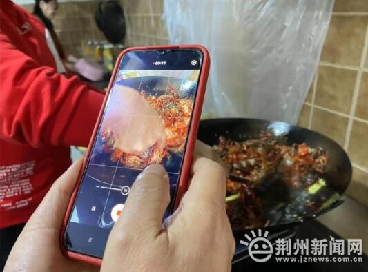 上午10點,荊州區(qū)菱角湖管理區(qū)楚源社區(qū)廣場舞蹈隊的多名隊員來到一家餐館,他們帶來的拿手菜是油燜大蝦。舞蹈隊隊員們手腳麻利,一大盆小龍蝦很快被清理干凈,記者注意到其中一名舞蹈隊隊員并沒有參與做菜,而是拿著手機記錄過程。燒油、放佐料、翻炒、慢燉,半個小時后,色香味俱全的油燜大蝦做好了,伙伴們立即圍過來嘗鮮。這開心的一幕幕也被蘭姨媽用手機記錄了下來。