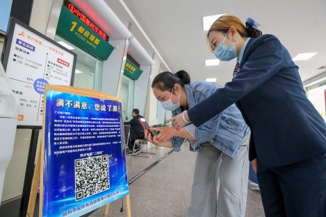 5月11日,在位于沙市區(qū)江津路的郵儲銀行荊州市太岳營業(yè)所,剛辦完業(yè)務(wù)的顧客通過掃描二維碼登陸“雙優(yōu)督辦群眾掌上評議”頁面,為該網(wǎng)點(diǎn)的窗口服務(wù)“打分”。