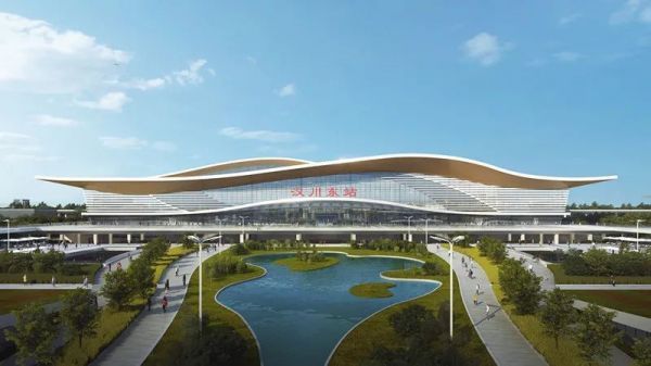 中建三局相關(guān)設(shè)計(jì)方介紹,漢川東站站房主體按三層布局。一層為出站層,與車站廣場銜接,二層為站臺層,三層為高架候車層。站房及站臺雨棚均為框架結(jié)構(gòu),雨棚結(jié)構(gòu)形式為單柱雙臂懸挑。站房屋蓋結(jié)構(gòu)采用曲面鋼網(wǎng)架結(jié)構(gòu),為不對稱曲線造型。該站以“層波疊浪、水韻漢川”為設(shè)計(jì)理念,緊扣交通建筑簡明大氣的風(fēng)格特征,通過抽象的形式語言,傳達(dá)“水”文化精髓。