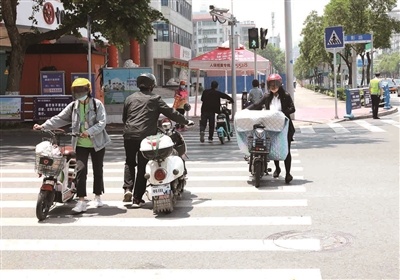 過人行道時,市民主動下車推行摩托車或電動自行車。張彩云 攝