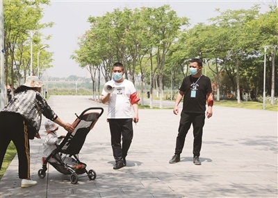 鳳凰湖濕地公園管理處工作人員在園區(qū)勸導游客安全、文明游園。張彩云 攝