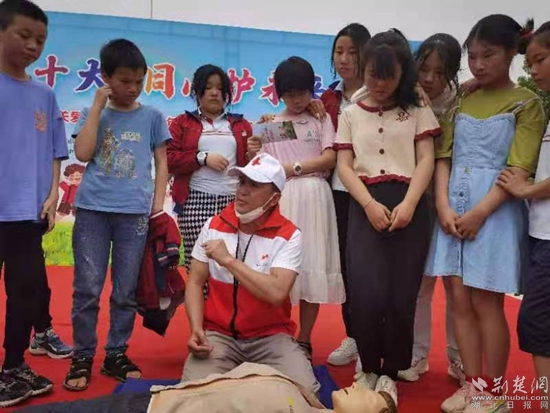 武穴市紅十字會老師通過情景模擬、現(xiàn)場教學等方式為孩子們上了一堂生動的應急救護課。通訊員 供圖