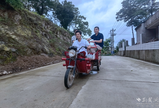 尹傳波騎著三輪車帶陽新殘聯(lián)理事長劉富華(右)到村民家體驗(yàn)出診。這樣的出診,尹傳波默默干了16年。通訊員 供圖