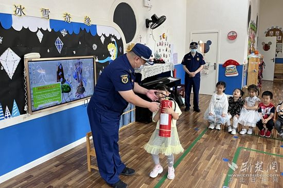 同時,消防人員為幼兒園全體老師講解了干粉滅火器的正確使用方法,并教育小朋友在平時不要去玩滅火器。最后,消防人員向萌娃們送上了精心準(zhǔn)備的兒童消防車、家庭防火漫畫和節(jié)日的祝福。