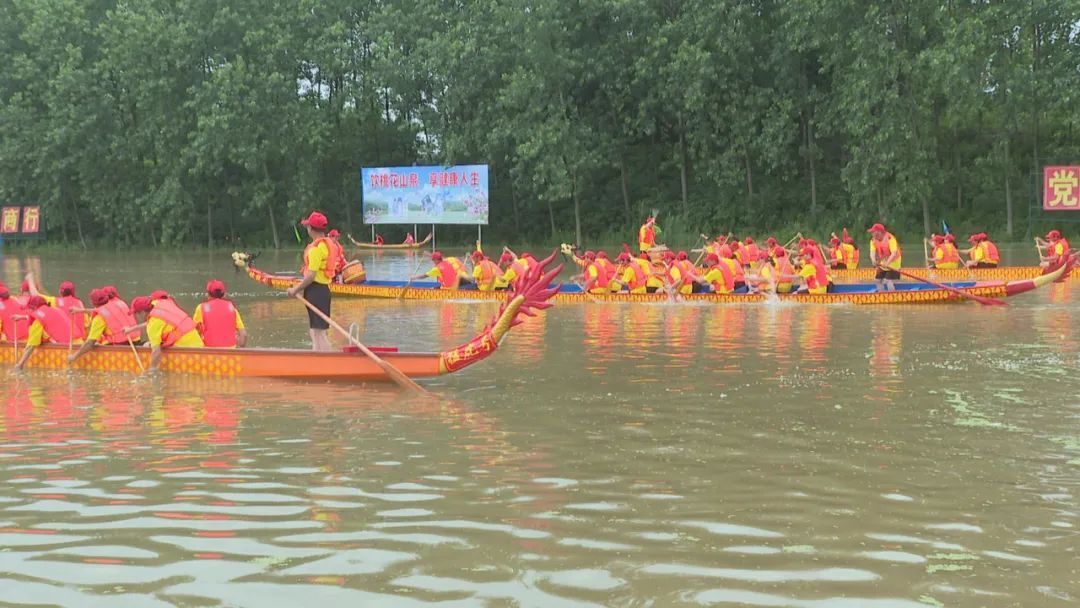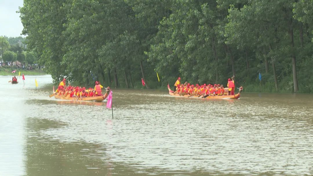 龍舟飛渡,激起千層浪。當(dāng)比賽的鼓聲響起,參賽的三支龍舟似箭一般沖出起點,頓時,龍舟上緊湊有力的鼓聲和岸上群眾震耳的吶喊聲交織在一起,回蕩在水面上。隊員們在鼓聲的號召下奮力揮槳,一艘艘龍舟劈波斬浪,奮勇爭先。
