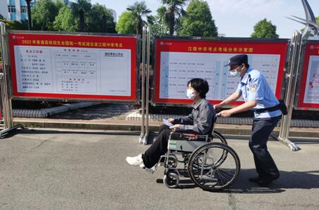 江陵中學(xué)考點(diǎn)門口,護(hù)考民警發(fā)現(xiàn)一位考生因小腿骨折、行動不便,只能坐輪椅前來參加高考。由于疫情防控和考試相關(guān)規(guī)定,家長不能進(jìn)入考場,民警立即接過“護(hù)送棒”,合力將考生送進(jìn)四樓考場。