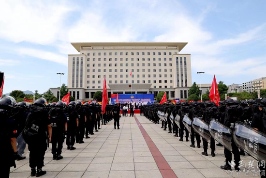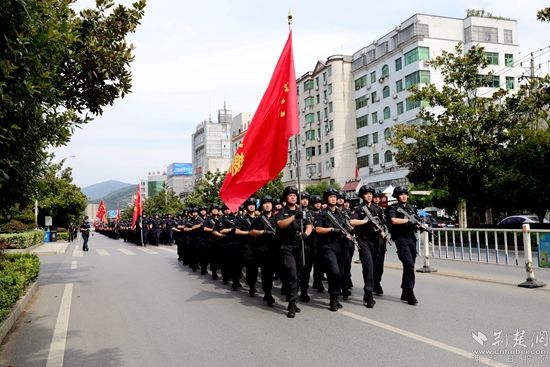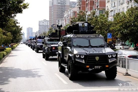 來自各縣(市、區(qū))公安局、市局特巡警支隊的500名特巡警、48輛裝甲車、運兵車、指揮車組成的8個方隊準時集結(jié),警容嚴整、裝備齊整、斗志昂揚,場面超燃震撼,堪比電影大片,充分展示了咸寧公安隊伍敢打必勝、頑強拼搏、紀律嚴明的精神風貌和良好形象。