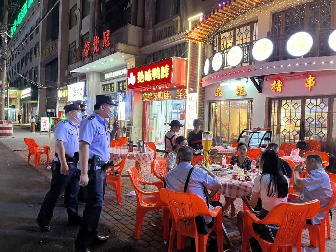 ▲開(kāi)發(fā)區(qū)公安分局長(zhǎng)港路派出所民警提醒宵夜群眾加強(qiáng)安全防范