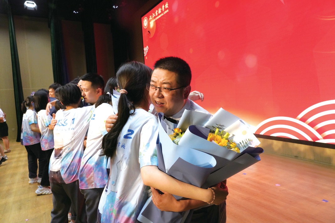 6月17日,漢江實驗學(xué)校舉行“傳承榮光·感恩母?!?022屆九年級畢業(yè)典禮,為即將參加中考的學(xué)子們加油鼓勁。圖為學(xué)生與老師擁抱,表達(dá)感激之情。圖/通訊員 涂銀玥 鮑玉