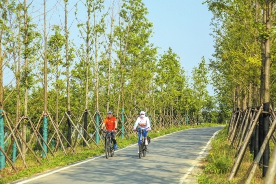 市民在環(huán)長湖濕地公園騎行。(張夢瑤攝)