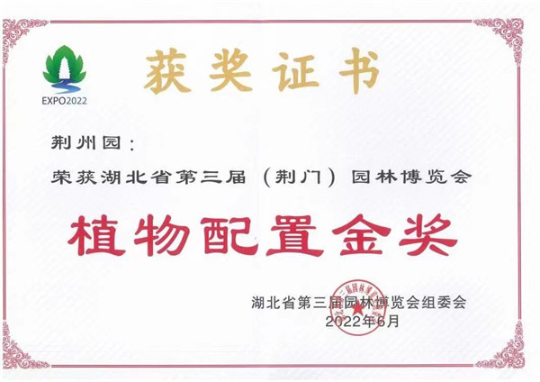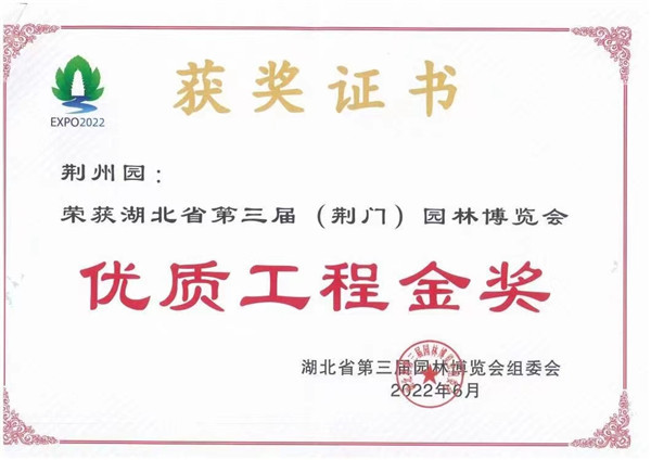 荊州園分別榮獲“最美園中園”綜合獎的榮耀金獎,展園單項獎中的展園設(shè)計獎銀獎、優(yōu)質(zhì)工程獎金獎、植物配置獎金獎、建筑小品獎金獎、智慧創(chuàng)意獎銀獎。