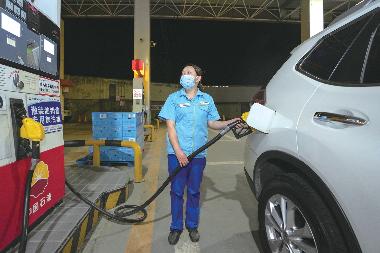 今日凌晨,朝陽(yáng)路中國(guó)石油加油站(商用車站)工作人員給汽車加油。