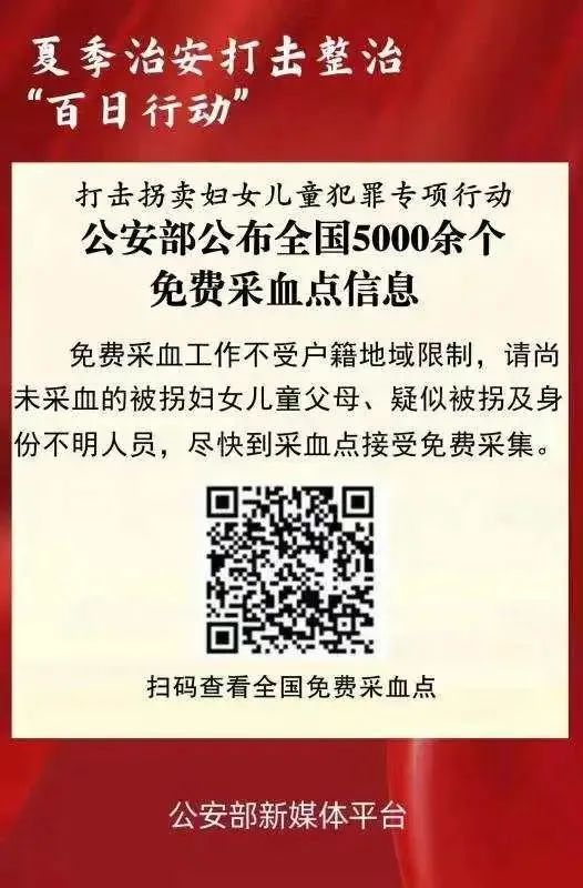 公安部有關(guān)負(fù)責(zé)人表示,免費(fèi)采血工作不受戶籍地域限制,請尚未采血的被拐婦女兒童父母、疑似被拐及身份不明人員,盡快到采血點(diǎn)接受免費(fèi)采血。希望社會各界和廣大群眾支持參與打拐工作,積極轉(zhuǎn)發(fā)擴(kuò)散5000余個免費(fèi)采血點(diǎn)信息,幫助更多離散家庭早日實(shí)現(xiàn)團(tuán)圓。
