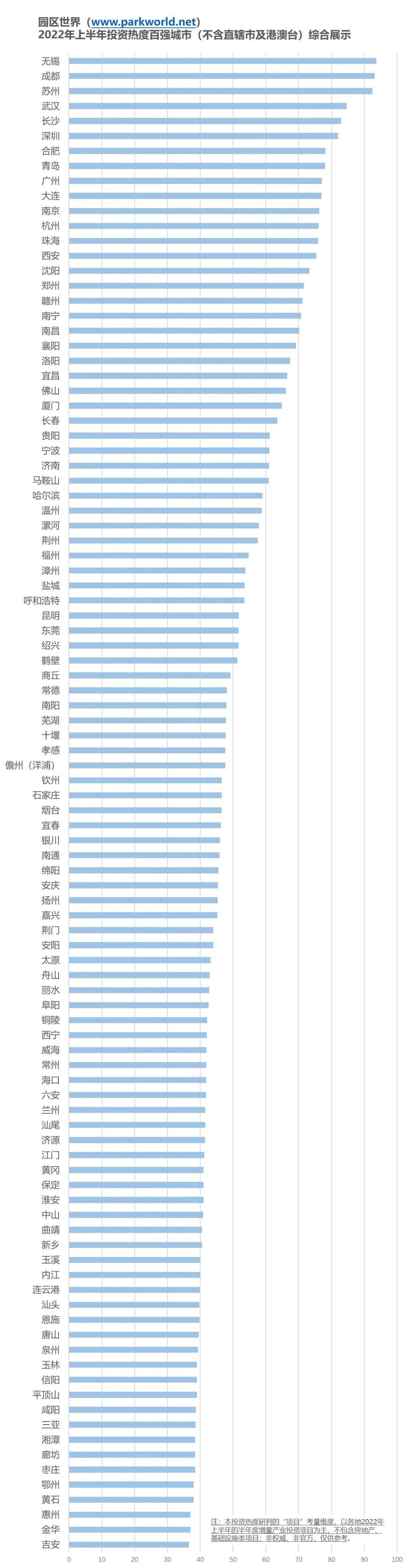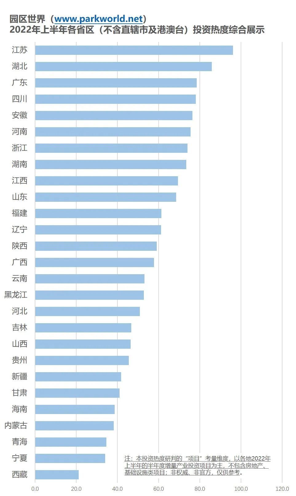 2022年上半年各省市投資熱度排行榜出爐。根據(jù)園區(qū)世界網(wǎng)開(kāi)展的全國(guó)省市投資熱度綜合研究,2022年上半年,江蘇、湖北、廣東位列省區(qū)層面前三甲,無(wú)錫、成都、蘇州位列城市層面前三甲。