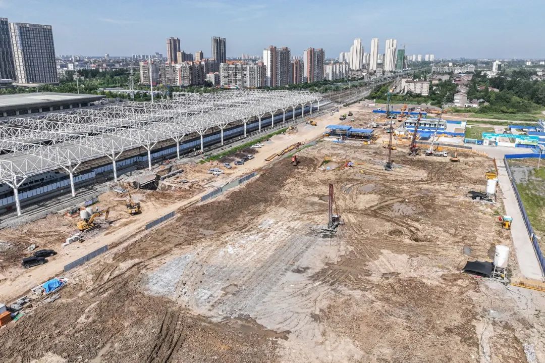 7月11日,位于荊州站北面,新建荊荊鐵路荊州站北站房施工現(xiàn)場一片繁忙。