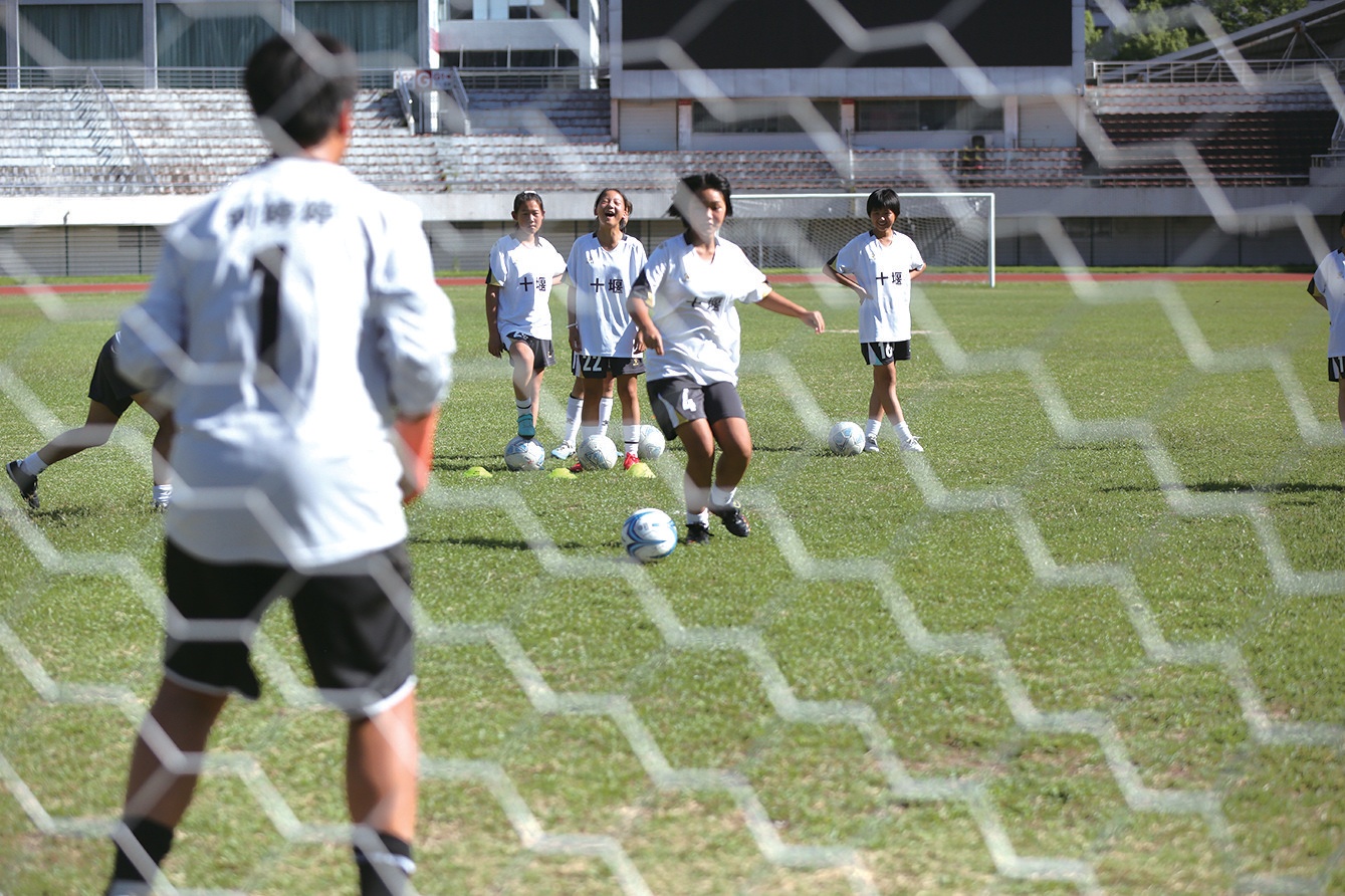 隊(duì)員們?cè)谟?xùn)練場(chǎng)練習(xí)射門。