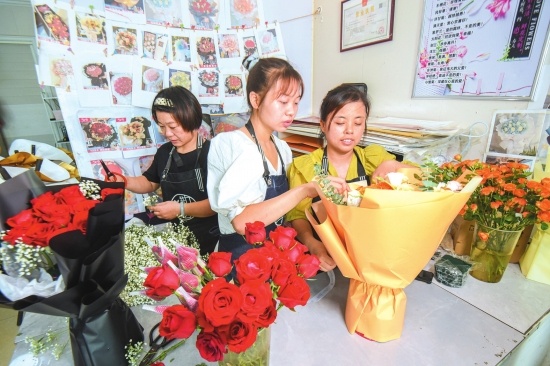 日前,在位于沙市區(qū)燎原路的荊州甜甜派花藝設(shè)計(jì)有限公司,大學(xué)生返鄉(xiāng)創(chuàng)業(yè)者肖甜恬(中)正在指導(dǎo)店員修剪鮮花,包裝花束。