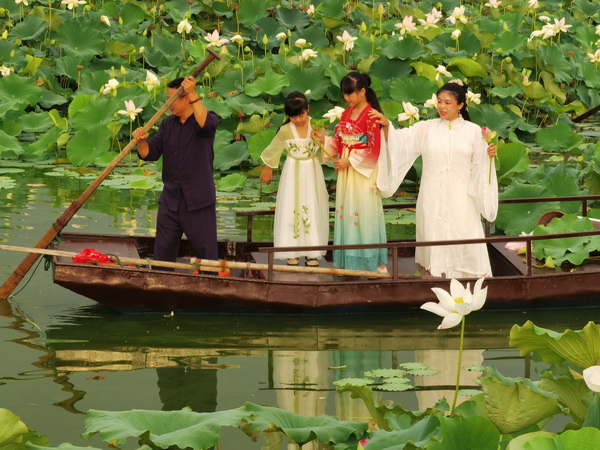 “武當(dāng)可采蓮,蓮葉何田田?!痹谖洚?dāng)山太極湖濕地公園,百畝荷花競(jìng)相開(kāi)放,微風(fēng)輕拂,碧波蕩漾,花香四溢,為炎炎夏日增添了詩(shī)意。身著漢服的古琴師帶著兩名采蓮少女,泛著小舟,暢游在花海,采摘蓮子和荷葉,為即將制作的消夏納涼荷花茶、消暑湯做準(zhǔn)備,體驗(yàn)不一樣的大暑節(jié)氣,勾勒出一幅美妙的圖畫(huà)。