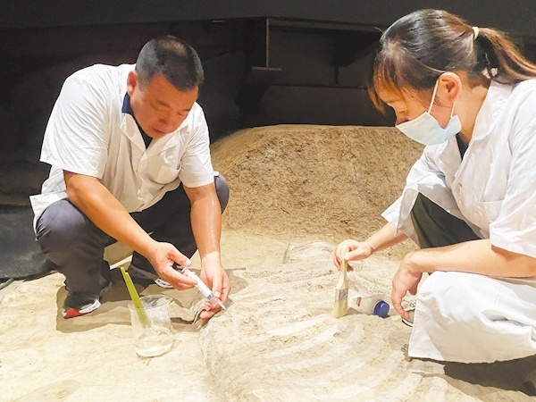 一號(hào)車馬坑文保技術(shù)人員對(duì)車馬遺跡進(jìn)行“日常保養(yǎng)”。(湖北日?qǐng)?bào)全媒記者 孟靜 攝)