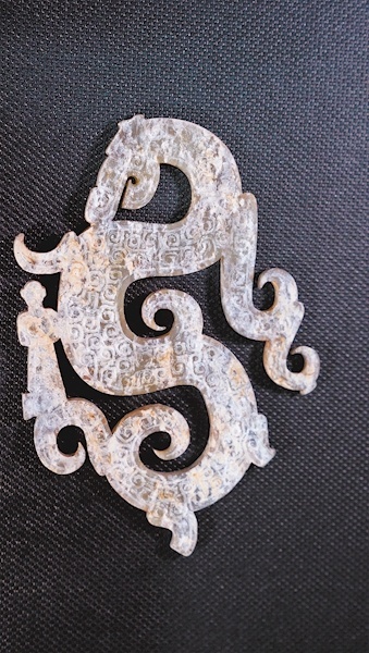 在出土的眾多玉器中,神人乘龍形玉佩極具楚文化特色,是寄托死者靈魂飄游升天的祝禱之物。該玉佩透雕為一條盤旋飛舞的龍形,龍尾上倚立一人,雙手捧于腹部。藝術(shù)造型表現(xiàn)出譎詭精絕的獨(dú)特風(fēng)格,透映出楚人對(duì)自然生命的孜孜探索和浪漫情懷。
