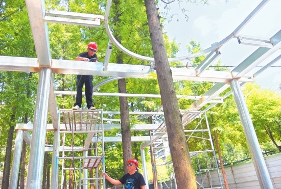 8月1日,在沙市區(qū)長(zhǎng)港路游園項(xiàng)目工地,施工人員正在搭建景觀(guān)涼亭鋼構(gòu)。不久之后,附近居民就可在這個(gè)新建的口袋公園里休憩娛樂(lè)了。