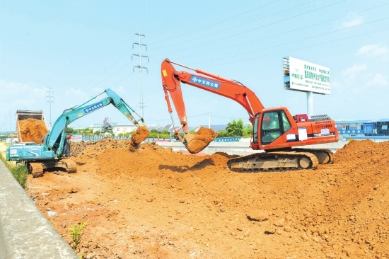 8月1日,由中交第四公路工程局建設(shè)的引道施工現(xiàn)場,多輛大型施工車正在填路面夯基礎(chǔ)。