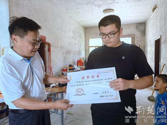 剛吃完飯,中午一時許,鄂州市勞動就業(yè)服務(wù)中心副主任、駐郭檔村第一書記曾勝,郭檔村黨支部副書記郭細(xì)崇等人趕往郭俊峰家中,將“阿里巴巴天天正能量”的獲獎證書送給郭俊峰。