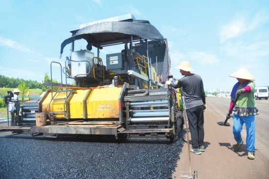 荊江大道(西環(huán)路—御河路)段,施工人員在烈日炎炎下,忙作業(yè)、趕工期。