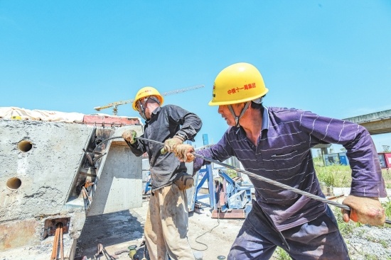 跨江漢運河特大橋項目6號橋墩建設(shè)現(xiàn)場,工人正在對預(yù)制梁穿插鋼絞線,抓緊項目施工。