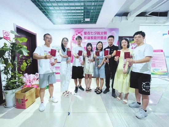 浪漫的“儀式感”在我市多地婚姻登記服務(wù)中心同步呈現(xiàn),各地提前為新人開通七夕婚姻登記預(yù)約通道,妝點了婚姻登記場所,引導(dǎo)準新人宣讀“結(jié)婚誓言”,為新人頒發(fā)結(jié)婚證、拍照并送上誠摯祝福,進行婚姻家庭輔導(dǎo)、優(yōu)生優(yōu)育等主題宣傳活動。