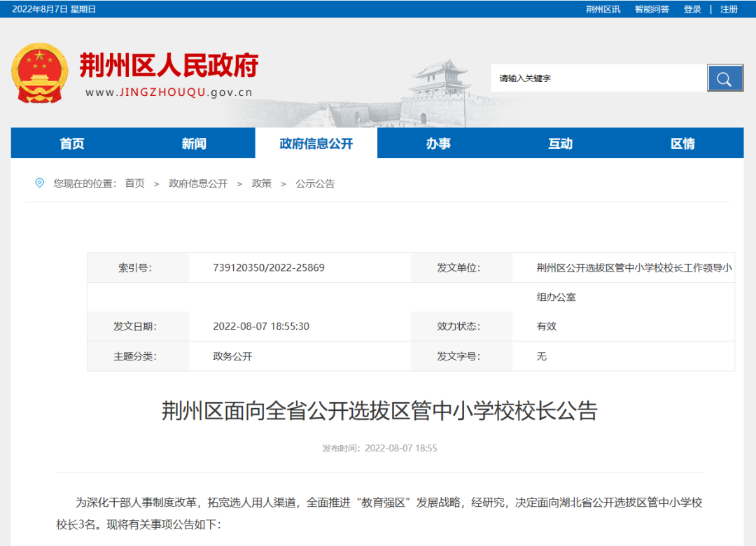 8月7日,荊州區(qū)人民政府網(wǎng)站發(fā)布《荊州區(qū)面向全省公開(kāi)選拔區(qū)管中小學(xué)校校長(zhǎng)公告》,面向湖北省公開(kāi)選拔區(qū)管中小學(xué)校校長(zhǎng)3名。