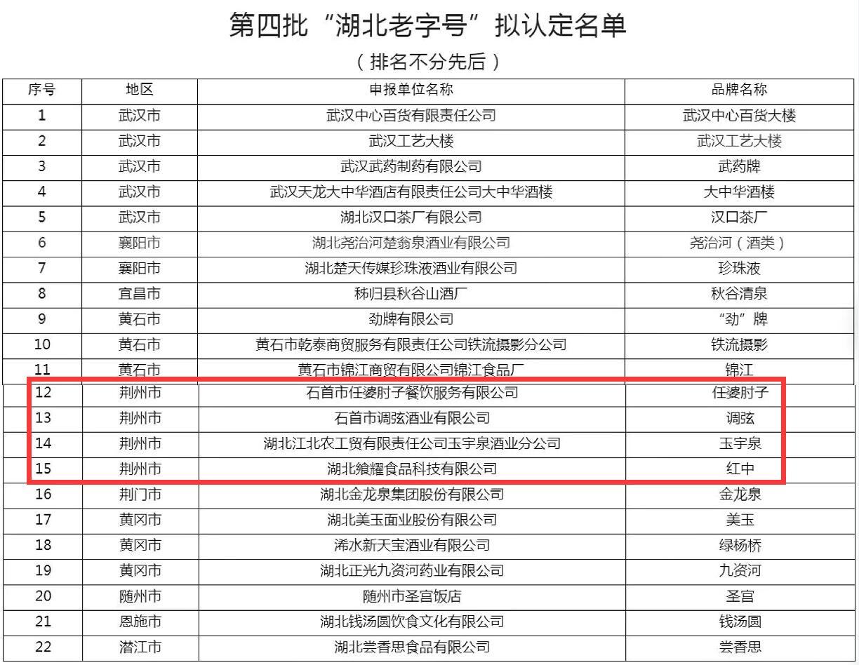 8月23日,省商務(wù)廳公示第四批“湖北老字號(hào)”擬認(rèn)定名單,全省有22家單位入選,其中我市4家企業(yè)上榜,公示日期自2022年8月23日至8月31日。我市入選的5家企業(yè)分別為石首市任婆肘子餐飲服務(wù)有限公司(品牌名稱:任婆肘子)、石首市調(diào)弦酒業(yè)有限公司(品牌名稱:調(diào)弦)、湖北江北農(nóng)工貿(mào)有限責(zé)任公司玉宇泉酒業(yè)分公司(品牌名稱:玉宇泉)、湖北饗耀食品科技有限公司(品牌名稱:紅中)。