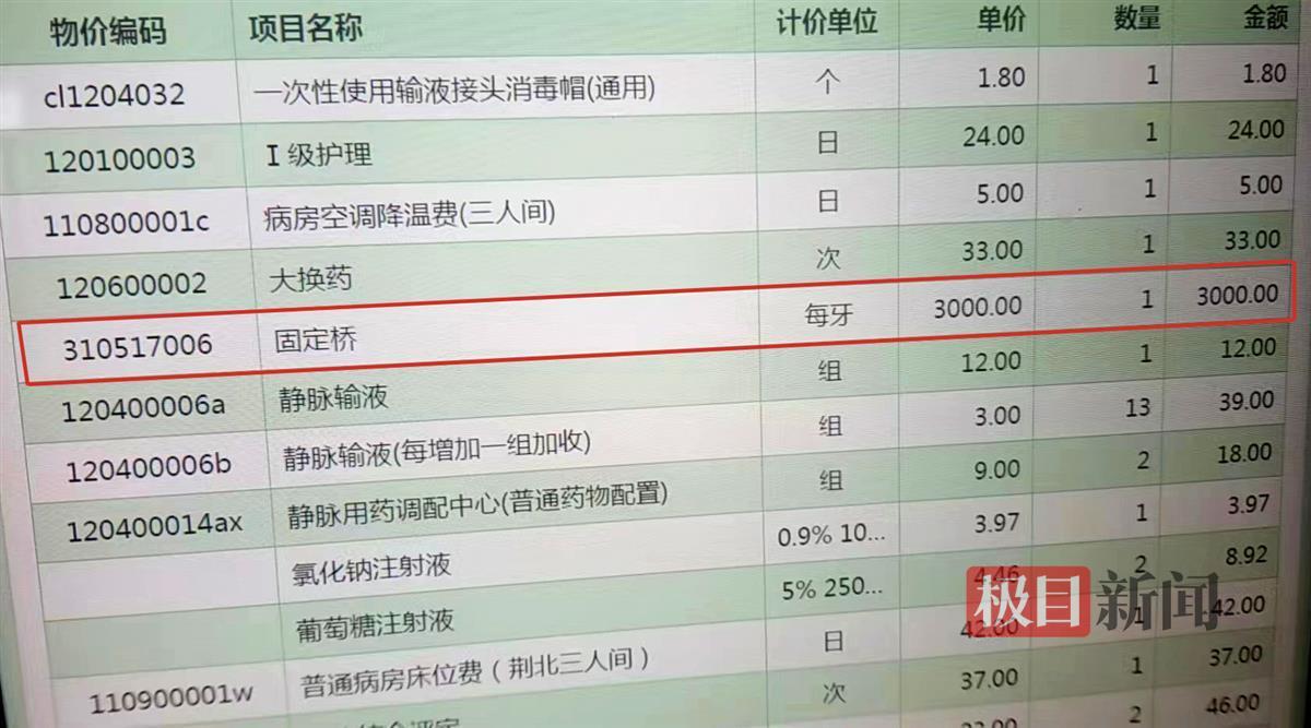 張先生于是到荊州市中心醫(yī)院的住院自助系統(tǒng)查詢。令他十分驚奇的是,膽結(jié)石手術竟然出現(xiàn)了一項“固定橋”的費用,單價顯示“每牙3000元”,兩牙共計6000元。