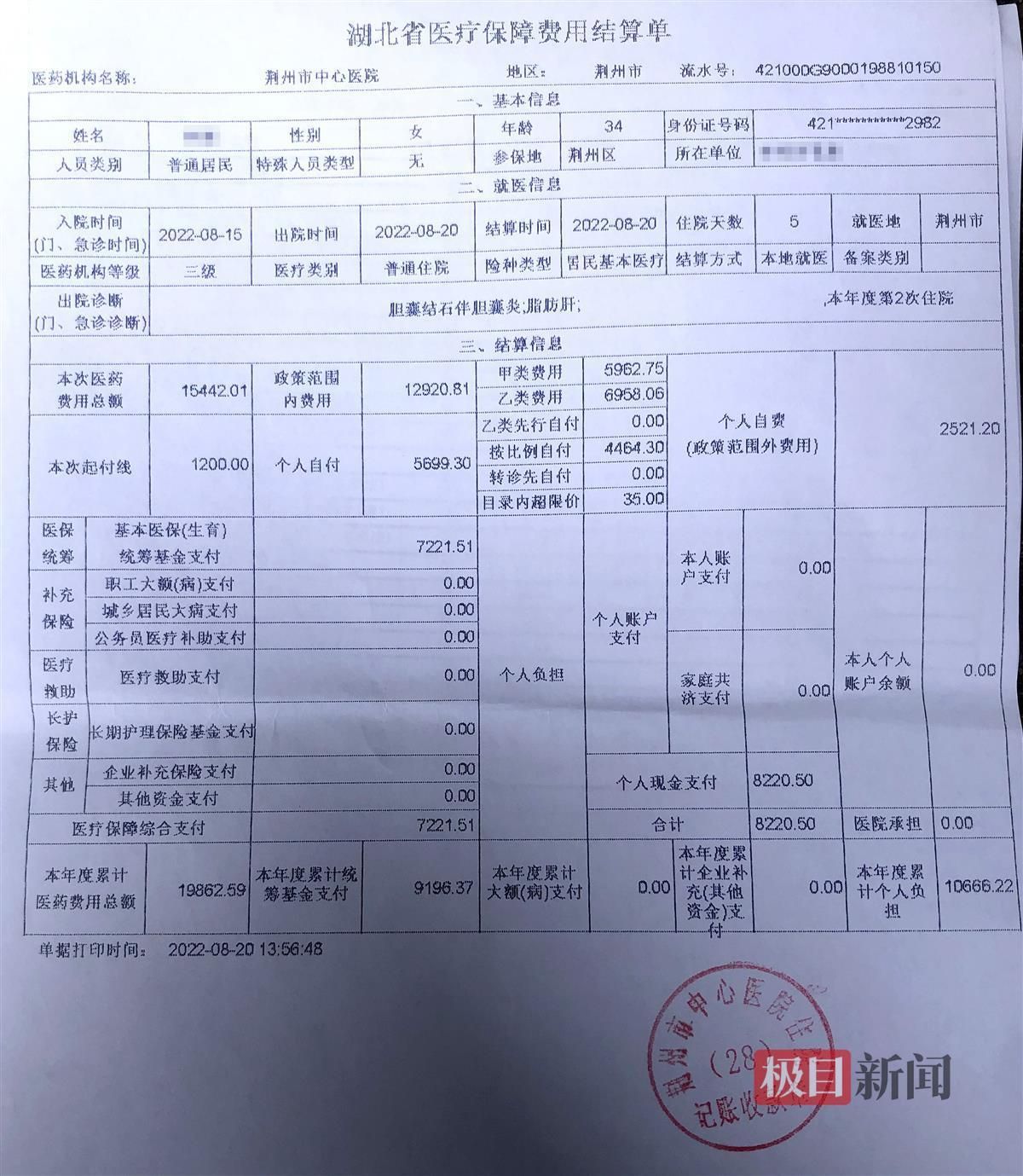 荊州市中心醫(yī)院給林女士出具的住院結(jié)算清單。(記者黃志剛 攝)