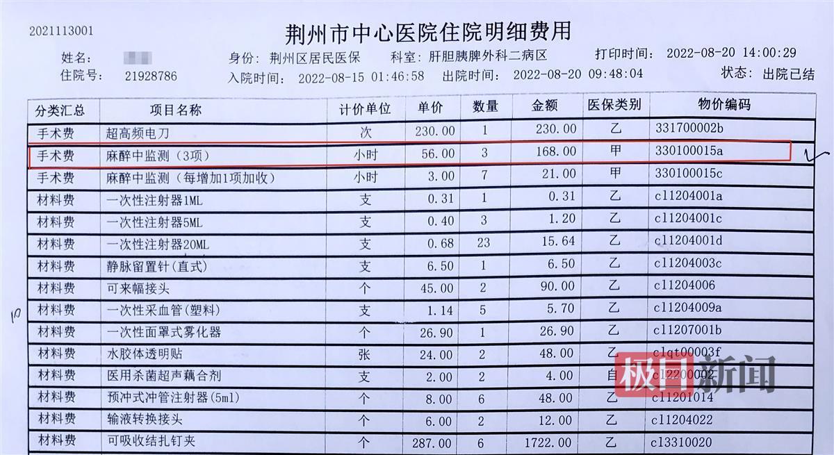 按照住院明細,“麻醉中檢測(3項)”單價56元/小時,總共時長為3小時,單項費用為168元。