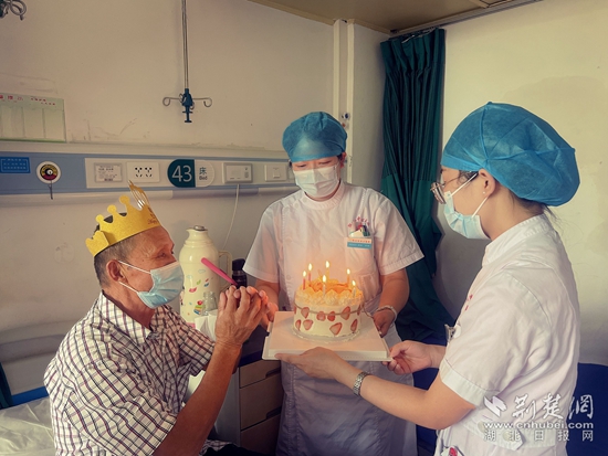 醫(yī)護人員將插上蠟燭的生日蛋糕端到床邊,64歲的余爹爹嘴巴微微顫抖著,他似乎想說些什么,眼中早已閃爍著晶瑩的淚花。原來這天是余爹爹的生日,中心醫(yī)院腫瘤科的責(zé)任護士高娟、肖平正為他慶祝著。