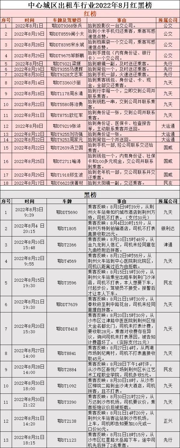 9月13日,市運管局發(fā)布中心城區(qū)出租汽車行業(yè)2022年8月紅黑榜,18輛文明出租車及駕駛員榮登紅榜,13輛違規(guī)經(jīng)營出租車列入黑榜。