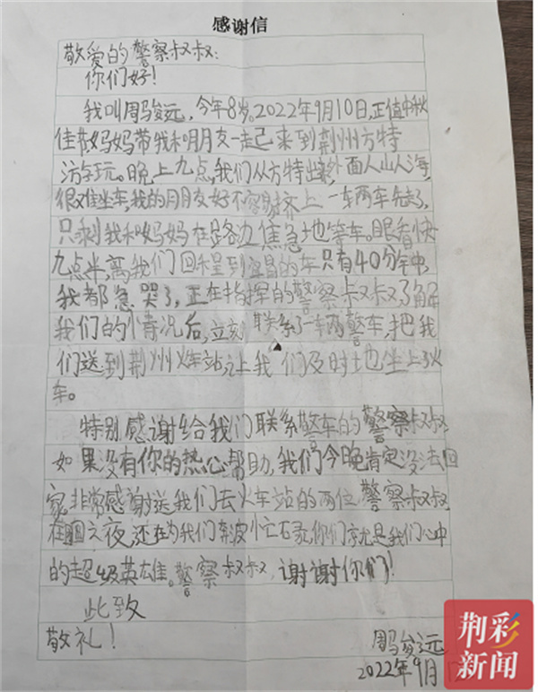 “特別感謝警察叔叔,如果沒(méi)有你們的熱心幫助,當(dāng)晚我和媽媽肯定會(huì)錯(cuò)過(guò)返程的火車,你就是我心中的超級(jí)英雄!”19日一大早,荊州交警收到了一封特殊的感謝信,里面還有一張合影照片,落款為一名8歲的小男孩。