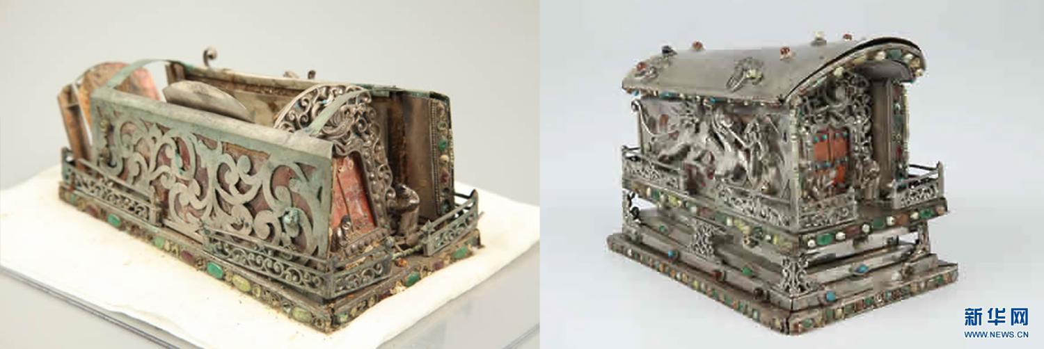 圖為唐代銀槨修復前(左)與修復后(右)對比。新華網(wǎng)發(fā)