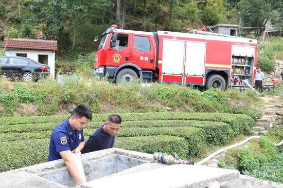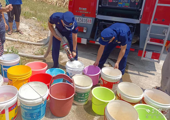 消防人員到達(dá)占昌塆村后,迅速鋪設(shè)水帶、接好水槍、打開水閥,將水注入該村的公用蓄水池和前來挑水的村民水桶里,為村民送水12噸。